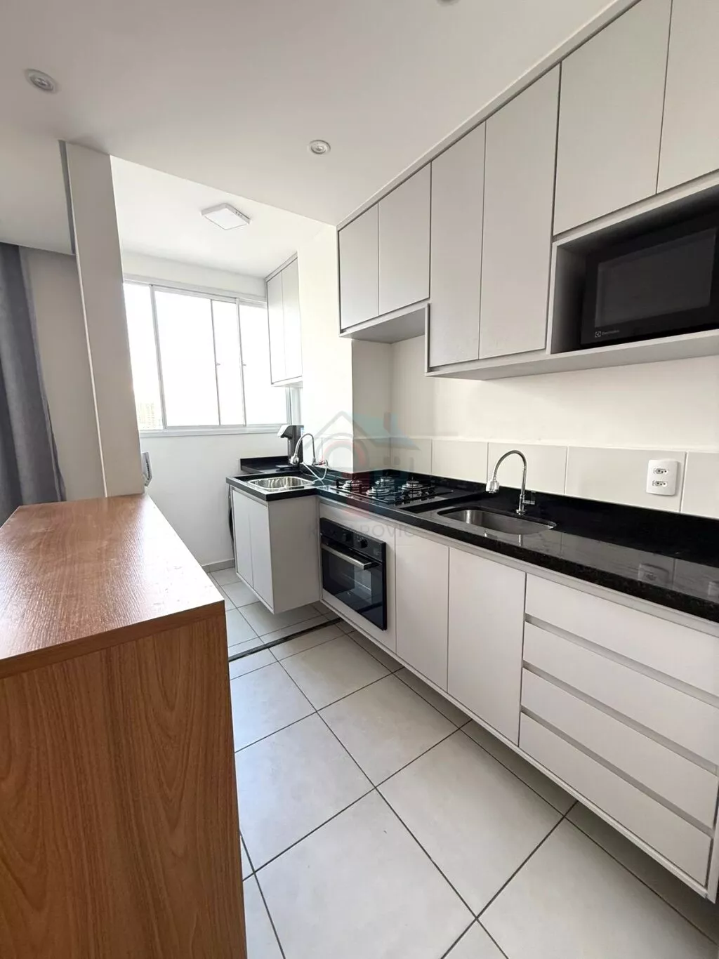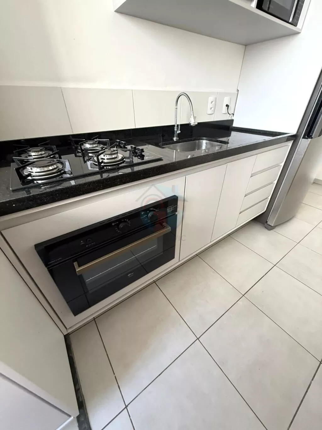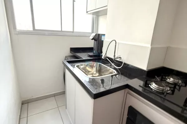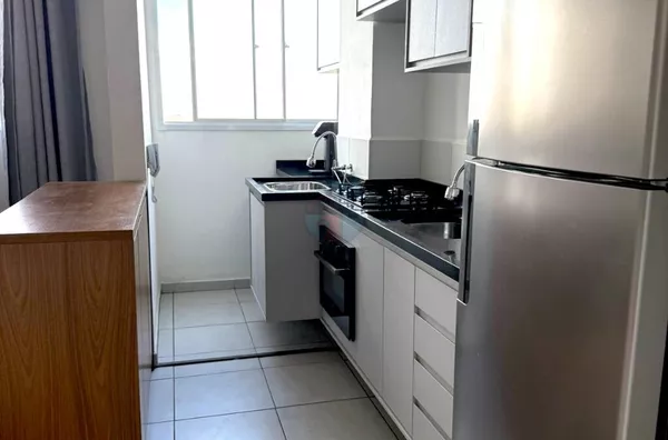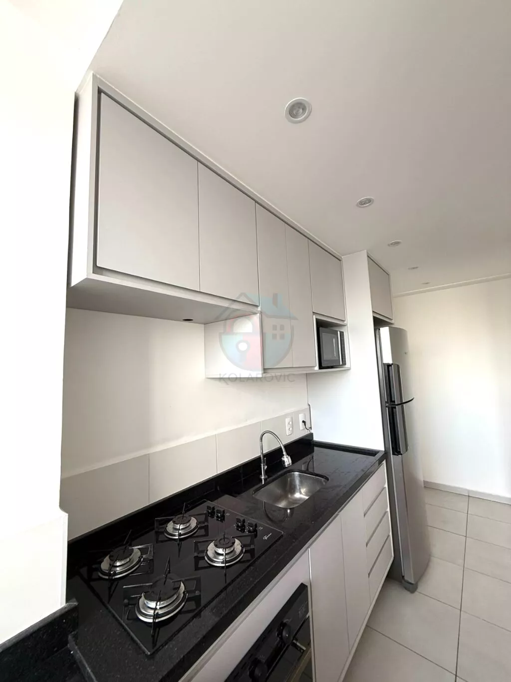 - Cozinha completa com armários, cooktop, forno a gás, geladeira duplex e purificador de água