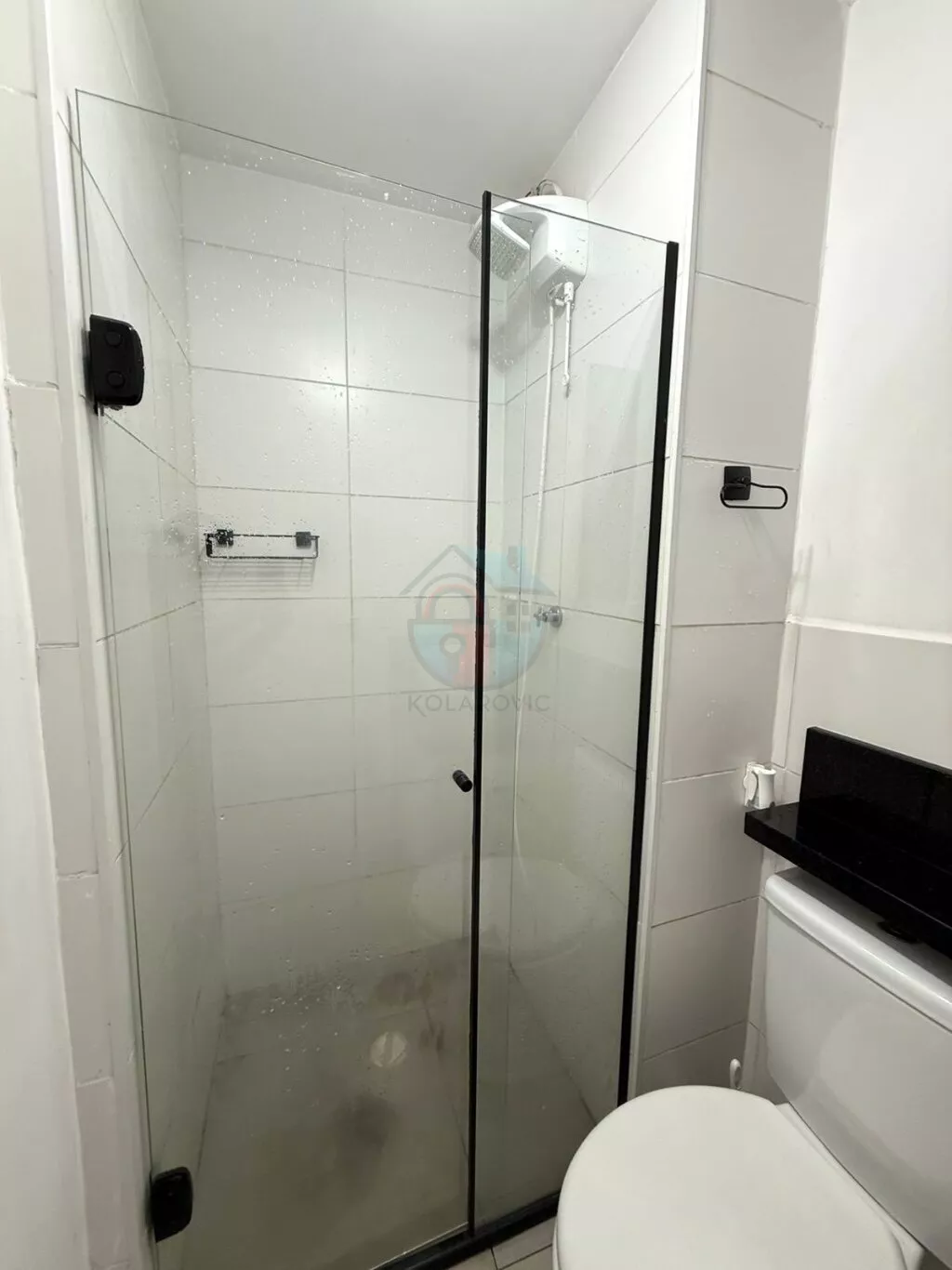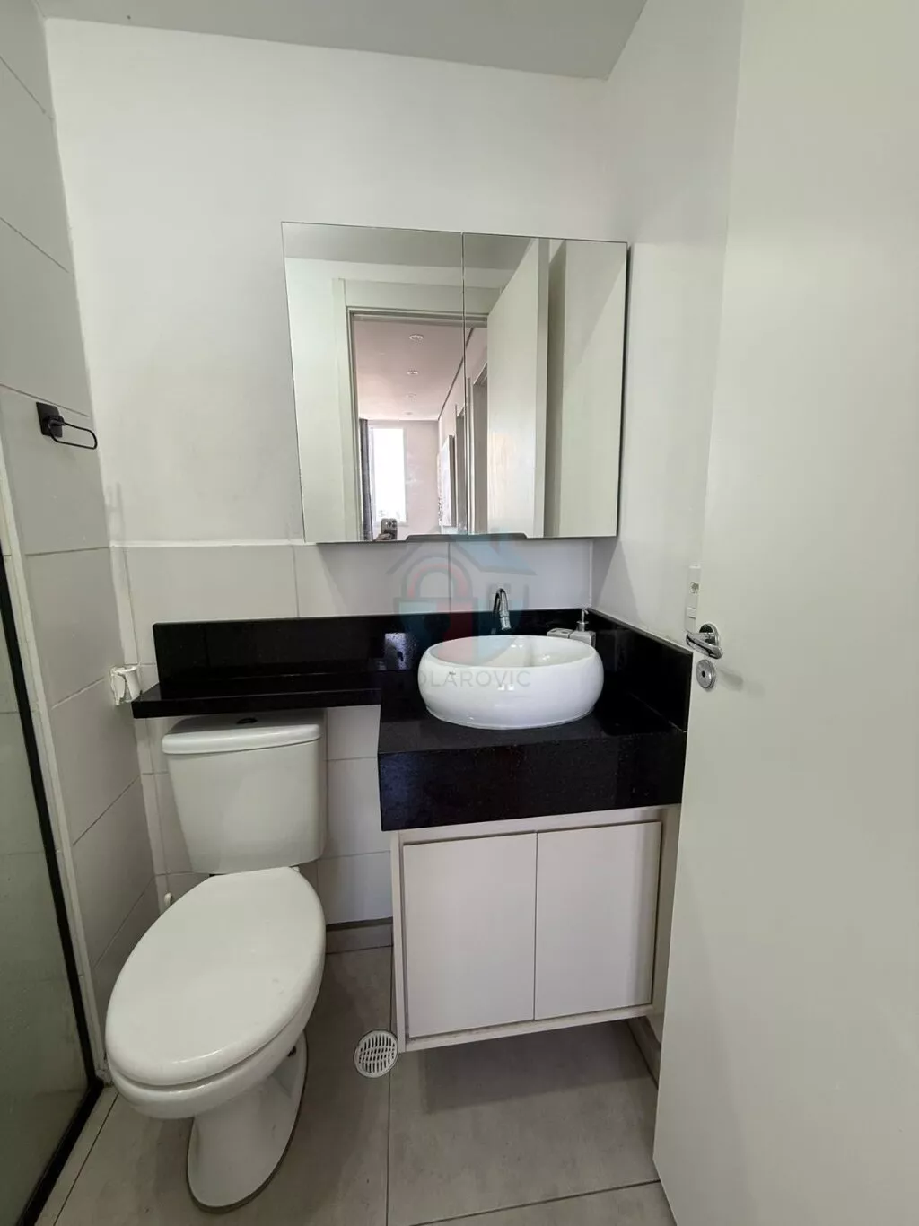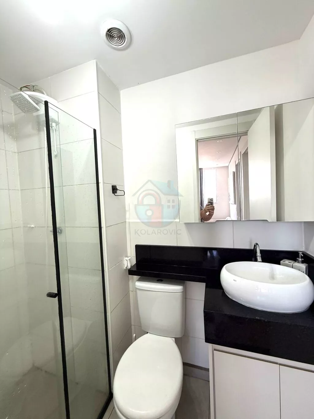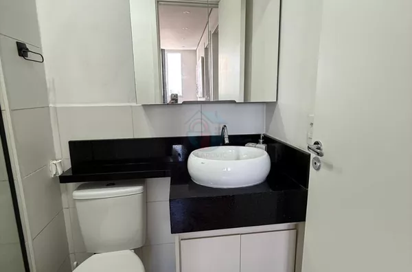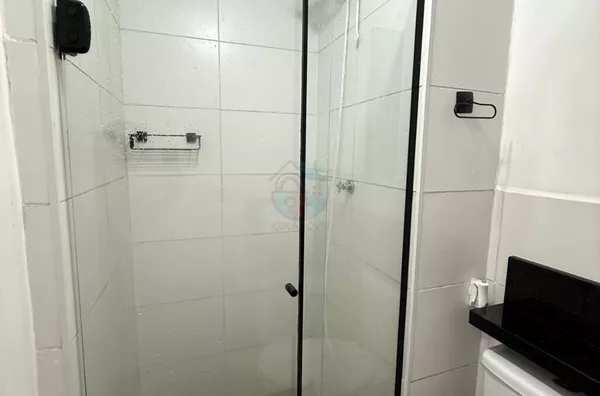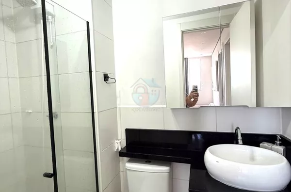 - Banheiro com gabinete, espelho, box e chuveiro